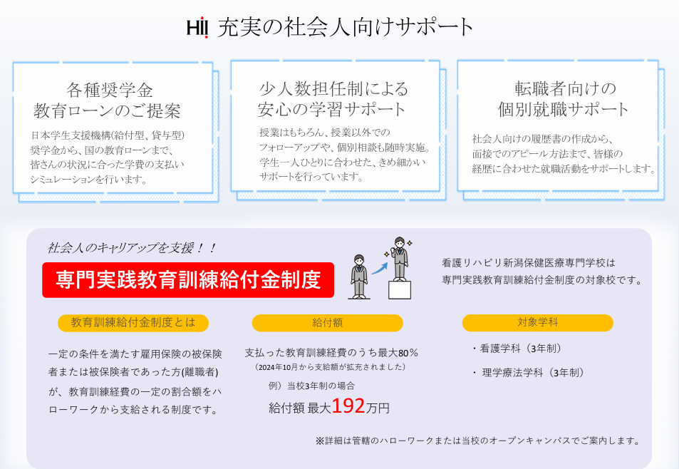 「看護リハビリ新潟保健医療専門学校」では社会人向けのサポートも充実してます!